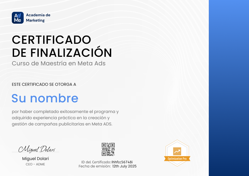 Sí. Al completar el curso recibirás un certificado oficial emitido por ADMe Perú, una academia reconocida en el ámbito del marketing digital y la publicidad online.